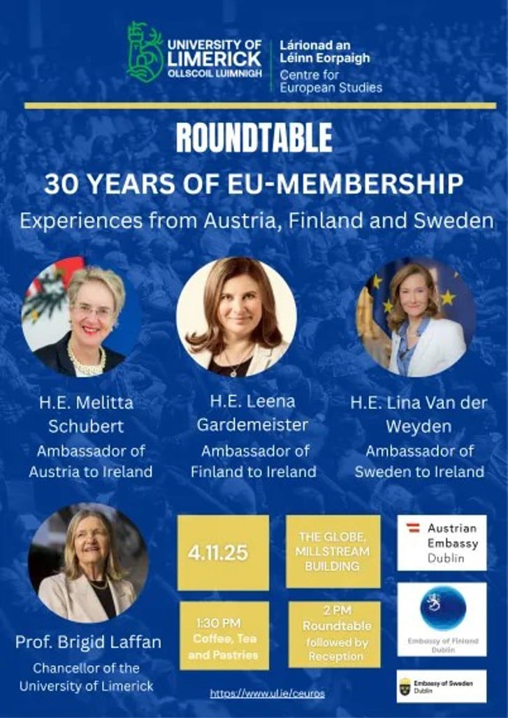 The Centre for European Studies (CEUROS) welcomes H.E. Melitta Schubert (Ambassador of Austria to Ireland), H.E. Leena Gardemeister (Ambassador of Finland to Ireland) and H.E. Lina Van der Weyden (Ambassador of Sweden to Ireland) for a Roundtable regarding their 30 years of EU-Membership.