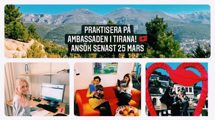Sveriges ambassad i Tirana erbjuder två praktikplatser i EU-kandidatlandet Albanien som ger en god inblick i ambassadens varierande verksamhet inom utrikes-, säkerhets- samt utvecklingspolitik, kommunikation och Sverigefrämjande. Välkommen med din ansökan, skriven på engelska, inklusive CV och studieintyg där antalet poäng m m framgår (motsv) senast den 25 mars 2022. Ansök via vårt rekryteringsverktyg.